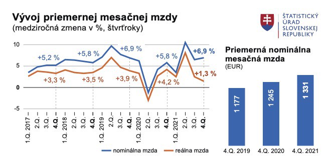 Výraznú časť z rastu miezd však zobrala v posledných mesiacoch vlaňajšieho roka vysoká inflácia, takže reálne mzdy sa zvýšili iba o 1,3 %. Ide o najnižší reálny rast od druhého štvrťroka 2020, kedy vplyvom pandémie COVID-19 po dlhej dobe reálna mzda na Slovensku klesla.
