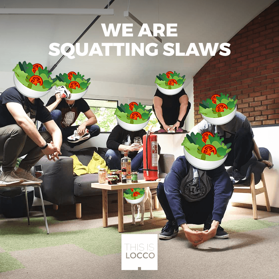 Namiesto hláv misky šalátu, na stole zaváraniny, fľaša alkoholu, hasiaci prístroj a všetci v známom „slovanskom“ podrepe, chýbajú už len značkové tepláky a dymiaca cigareta. Agentúra pridáva pops: „Vítame fanúšikov nie len v Košiciach, ale aj v Bratislave.“