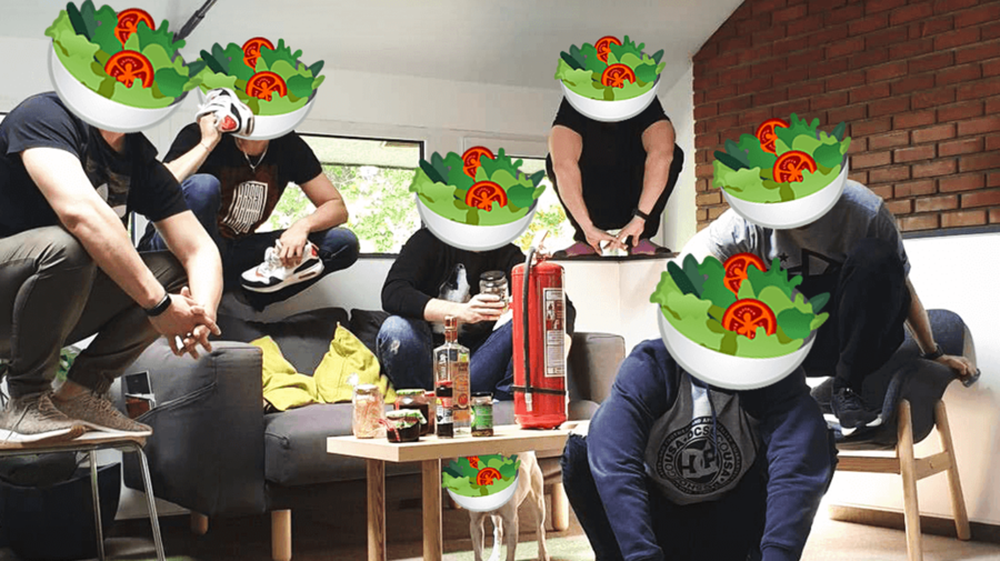 Namiesto hláv misky šalátu, na stole zaváraniny, fľaša alkoholu, hasiaci prístroj a všetci v známom „slovanskom“ podrepe, chýbajú už len značkové tepláky a dymiaca cigareta. Agentúra pridáva pops: „Vítame fanúšikov nie len v Košiciach, ale aj v Bratislave.“