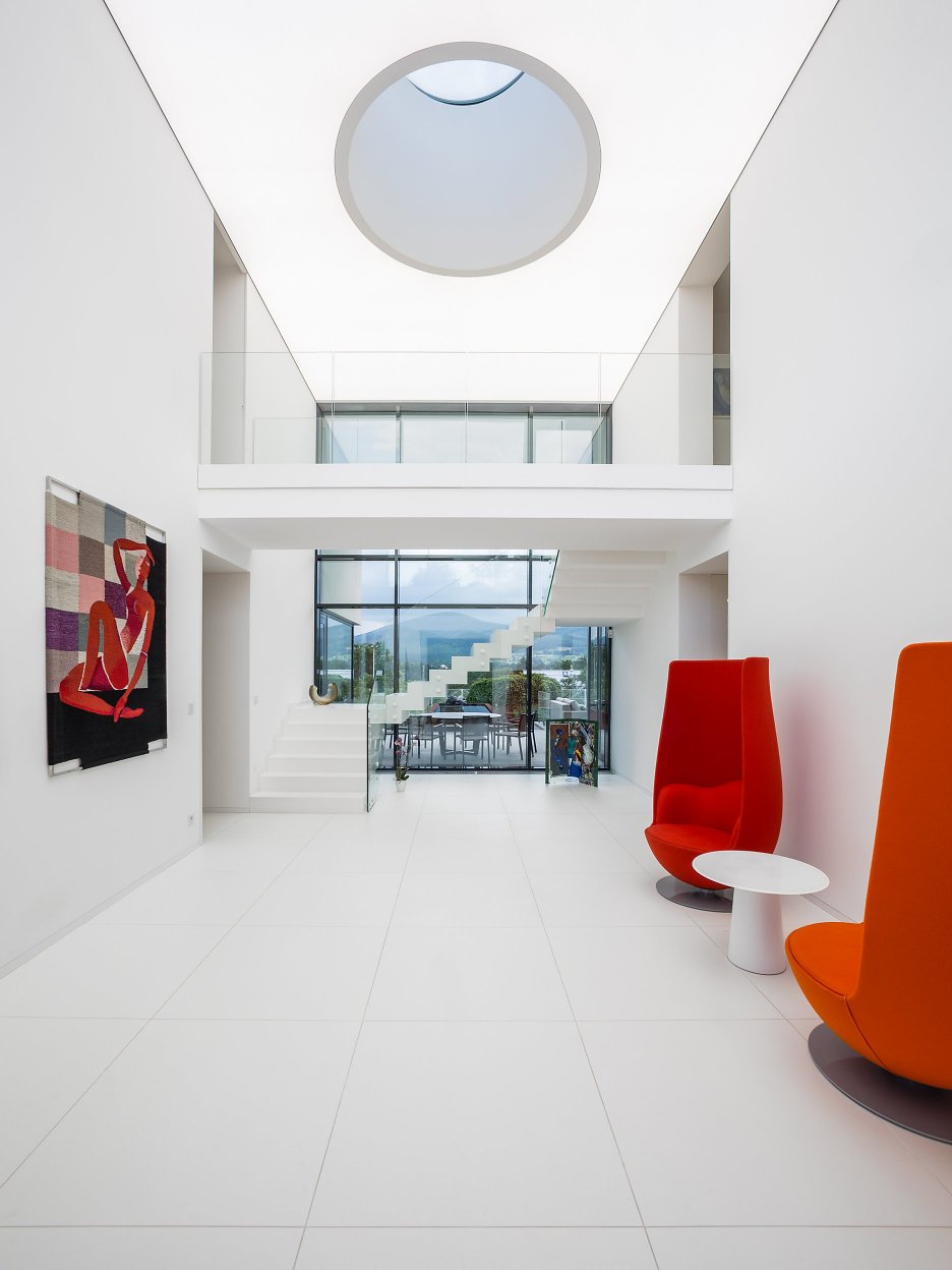 Z haly sa vstupuje do dennej časti domu. Na jednej strane sa nachádza obývacia izba a pracovňa, na opačnej strane sa stretáva viacero funkcií denného režimu objektu – jedáleň s kuchyňou, sociálne zariadenie (WC so sprchou), skladová časť, miestnosť pre domáce práce, šatník, biliardovňa, wellness s fitnessom a samostatný priestor krytej bazénovej haly. Do objektu rodinného domu sa vstupuje aj podružným obslužným vstupom od krytého parkovacieho státia pre dve osobné autá.
