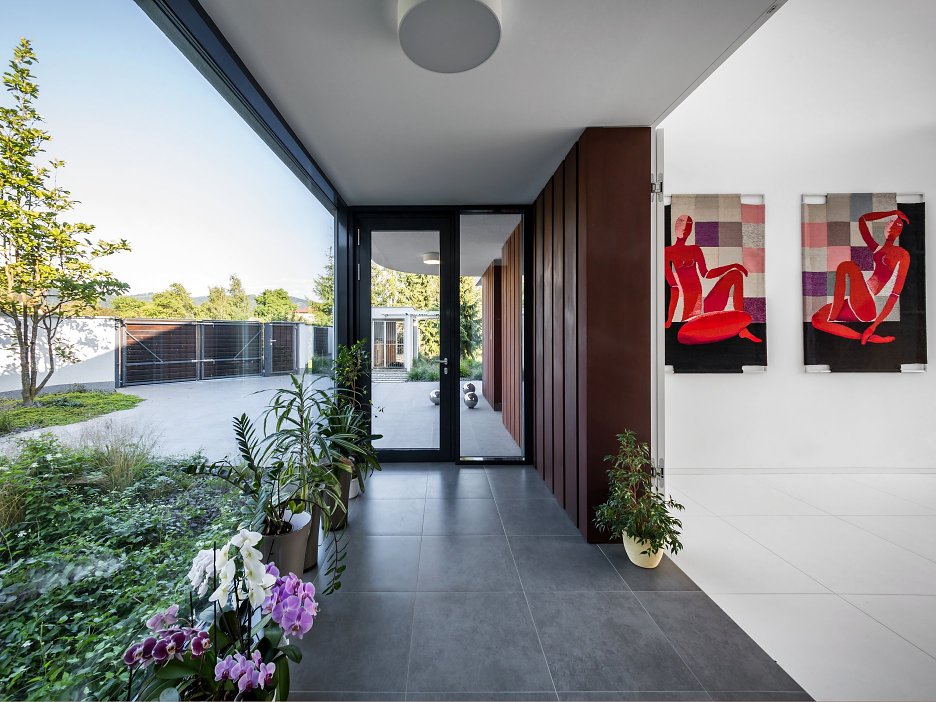 Oproti pôvodnej proporcii sa dom zväčšil o krytý priestor bazéna a mierne narástol v pozdĺžnom smere. Hlavným nosným prvkom dispozície je vstupná hala so schodiskom, ktorá je riešená ako otvorený priestor cez dve podlažia. Za presklenou stenou sa nachádza kryté átrium. Do átria sa vchádza samostatne z priestoru obývacej izby a z kuchyne s jedálňou.