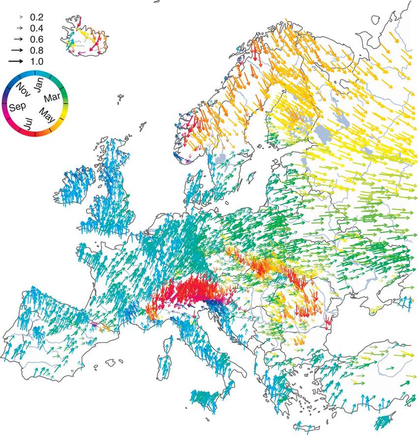 Naopak v oblasti severnej Británie, západného Írska, oblasti Škandinávie a severného Nemecka sa v súčasnosti vyskytujú tieto veľké povodne asi o dva týždne neskôr, ako tomu bolo pred niekoľkými desaťročiami.