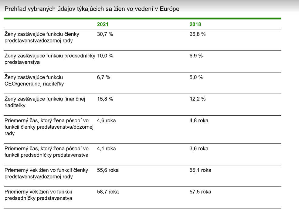 Prítomnosť väčšieho počtu žien však neznamená, že sa dostávajú na najvyššie vedúce funkcie – predsedníčok predstavenstva je pomerne málo (6,7 %) a žien vo funkcii CEO/generálnej riaditeľky je ešte menej (5 %).