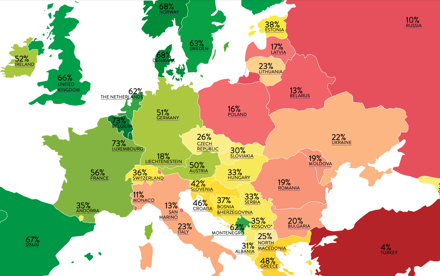 Žiadne prekvapenie neprinášajú ani tvrdé dáta, Slovensko skončilo na katastrofálnej 21. priečke európskeho LGBTQ indexu Rainbow Europe, ktorý hodnotí krajiny na stupnici od 0 % (porušovanie ľudských práv a diskriminácia) do 100 % (akceptácia a úplná rovnosť) podľa lokálnych zákonov ovplyvňujúcich aj životy LBGTQ ľudí.