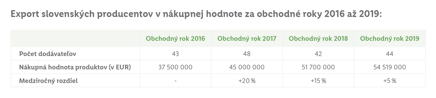 „Každým rokom nám rastie počet slovenských dodávateľov potravín, podiel ich výrobkov na našom sortimente a tiež ich celková hodnota. V poslednom uzavretom obchodnom roku sme slovenským dodávateľom zaplatili viac ako 320 miliónov eur v nákupných cenách – medziročne ide o nárast o 13 % alebo inak povedané o 40 miliónov eur. Aktívne podporujeme aj export slovenských firiem do zahraničia, ide o výrobky v hodnote desiatok,“ povedal Matúš Gála, generálny riaditeľ pre Lidl Slovensko.