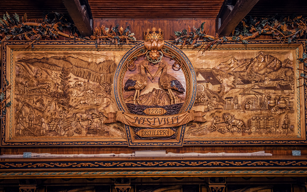Súčasťou prehliadky je napríklad degustačný bar, ktorý je zdobený rezbárskou prácou najšikovnejších umelcov z regiónu. Nájdeš tu napríklad obraz zachytávajúci prácu roľníkov v minulosti a erb, ktorý je jeho dominantnou. Obsahuje viacero prvkov, akými sú názov Nestville Distillery, ten vznikol odvodením od slovenského názvu obce Hniezdne, vyrytý je tu spolu s dátumom jej založenia, v roku 1286. Predná časť degustačného baru zobrazuje originálnu receptúru Nestville whisky, písanú rukou starého liehovarníka v jazyku a štýle písma tej doby, v zostrihu 8 obrazov.
