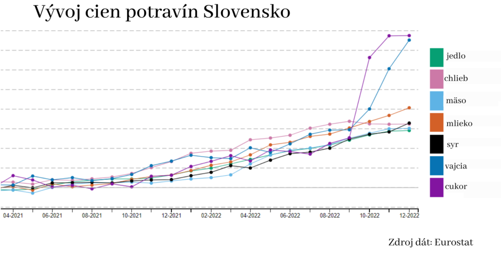 Na Slovensku najviac zdražel cukor, ktorý stúpol o 77,4 %. Nasledujú vajcia (75,1 %), plnotučné mlieko (40,6 %) a syr (32,2 %). U niektorých potravín ale vidno klesajúci trend, napríklad cena pečiva bola najvyššia v auguste, keď sa pohybovala na úrovni 33,7 %. V decembri klesla na úroveň na 32,3 %.