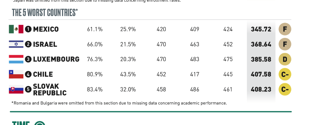 Slovensko sa ukázalo v samostatnom rebríčku krajín, ktoré nedokážu zabezpečiť adekvátne vzdelanie. Najhoršie dopadlo Mexiko, na druhom mieste je Izrael, na treťom Luxembursko a štvrtú priečku obsadilo Čile. Slovensko sa umiestnilo na chvoste tejto TOP 5. Napriek tomu nie je dôvod na radosť, pretože to naznačuje, že slovenská vláda by mala skutočne popracovať v oblasti vzdelávania detí a mládeže.