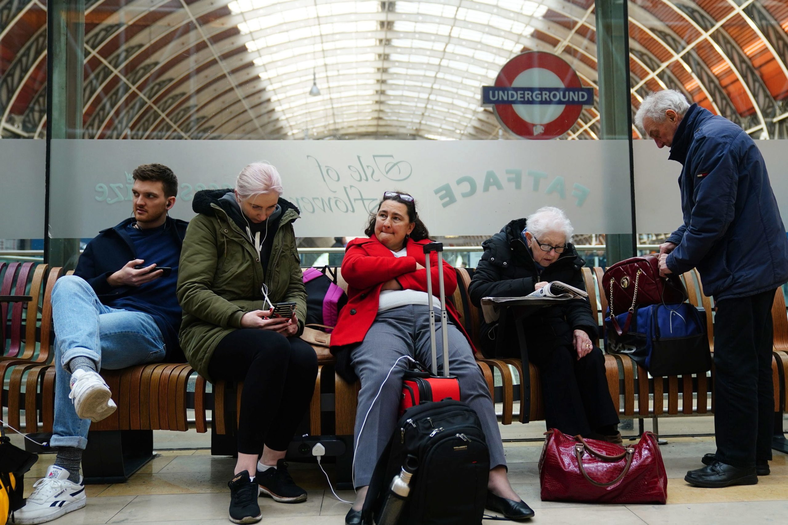zdroj: TASR/Victoria Jones/PA via AP - Cestujúci čakajú na stanici metra Paddington v Londýne, kde úrady pozastavili dopravu v dôsledku víchrice Eunice, ktorá udrela na západnú Európu v piatok.