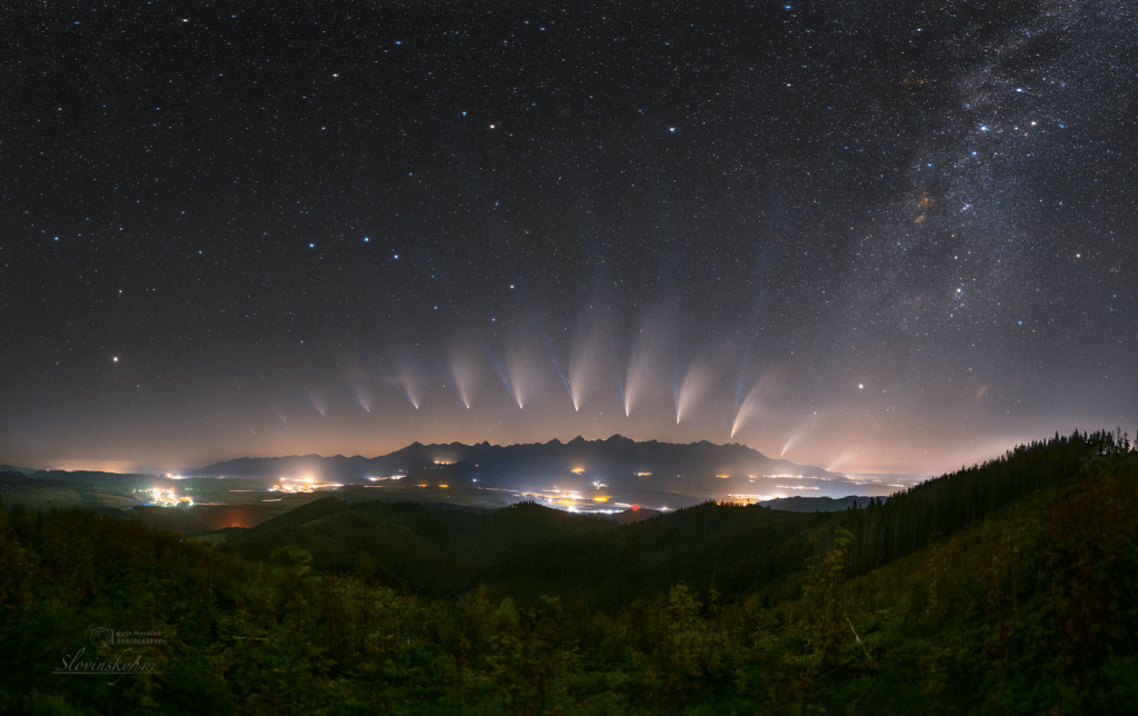 Nad našimi hlavami minulý rok, a to počas celého júla až do začiatku augusta objavovala kométa Neowise. Išlo o najjasnejšiu kométu za posledných trinásť rokov. Nebeské divadlo zaujalo, samozrejme, aj Tomáša. Spolu s českým kolegom Petrom Horálekom kométu sledovali a fotografovali takmer každý deň, aby vytvorili jedinečnú snímku.