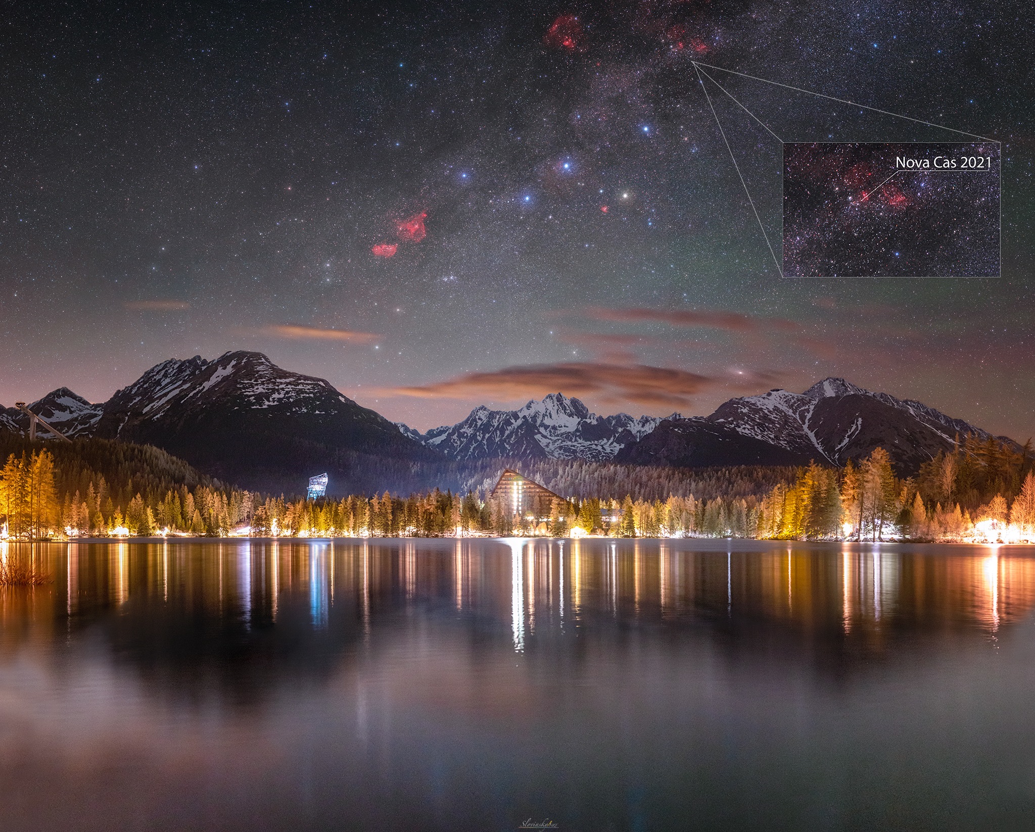 „Moja fotografia však vznikla panoramatickým snímaním a je vytvorená z viacerých segmentov, konkrétne sa skladá z 30 snímok. Na zábere vidieť Mliečnu cestu, jasné súhvezdie Kasiopeia pripomínajúce dvojité W, emisné hmloviny a jednu maličkú bodku, ktorá svedčí práve o existencii novy.“