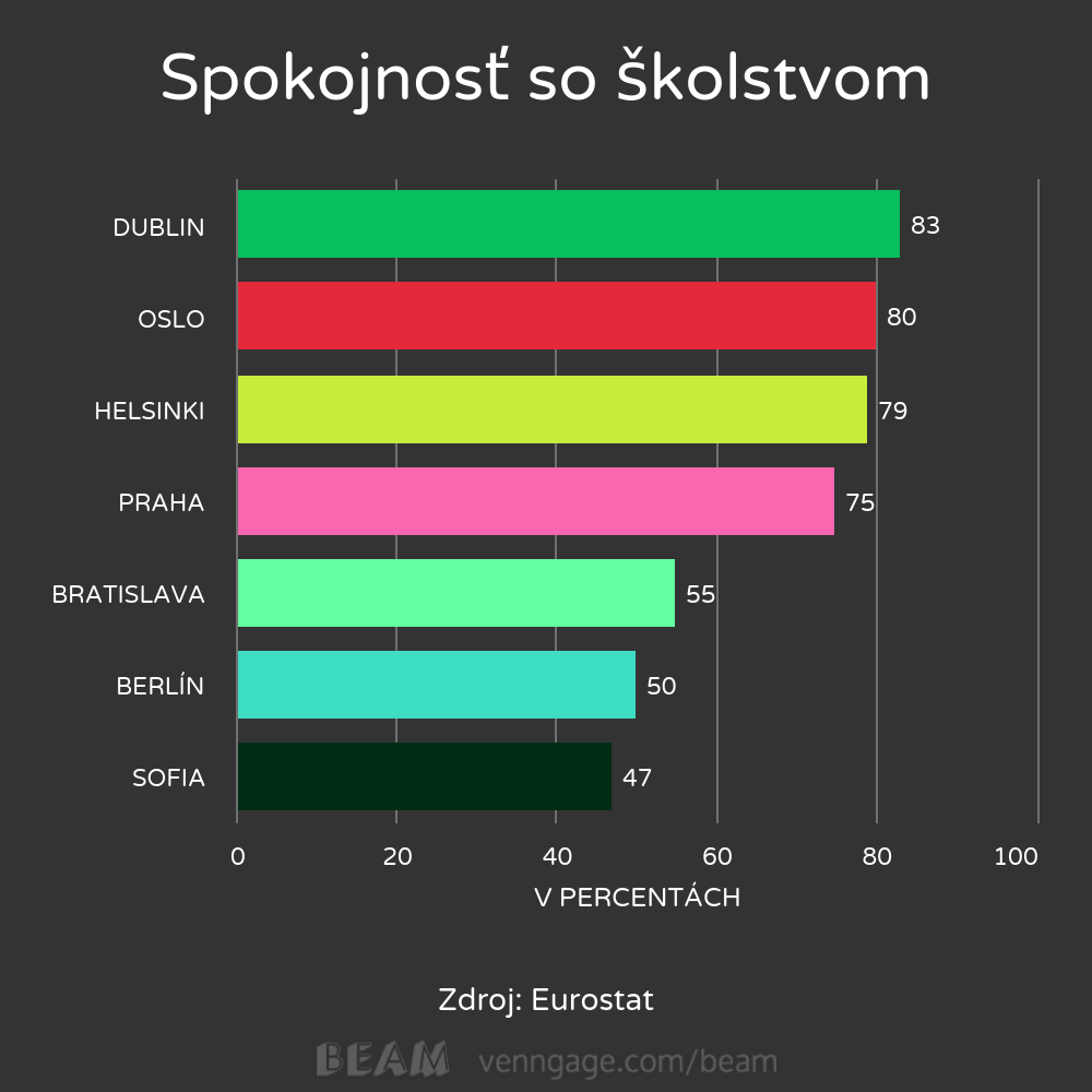 Eurostat nedávno publikoval štúdiu, ktorú vykonal ešte v roku 2015. Zaoberala sa životnou úrovňou v rôznych metropolách Európskej únie. Pozbieral a porovnal názory obyvateľov z 31 miest, aby zistil, ako sú spokojní so životom vo svojich metropolách. Okrem iného sa zameral aj na spokojnosť rodičov so školami, ktoré navštevujú ich deti.