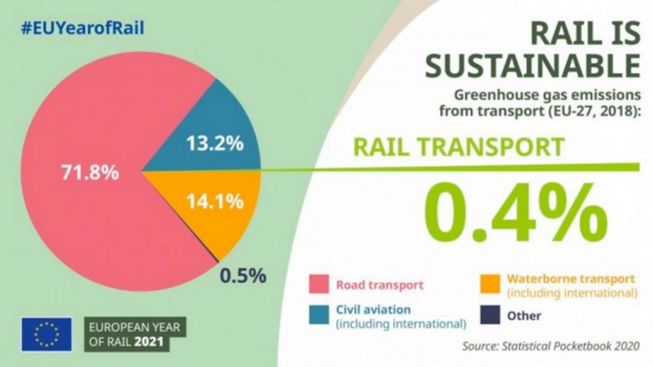 V Európskej únii sa nachádza až 201-tisíc kilometrov železníc, ktoré sú považované za jednu z najudržateľnejších možností transportu. Z celkových emisií vyprodukovaných v tejto oblasti za rok 2018 tvorili železnice podiel len 0,4 %. Najviac emisií vyprodukovala cestná doprava, a to až 71,8 %, po nej nasledovala vodná doprava, 14,1 %. Civilné letectvo dosiahlo 13,2 %. 0,5 % tvorila bližšie neidentifikovaná doprava, vyplýva zo Statistical Pocketbook 2020.