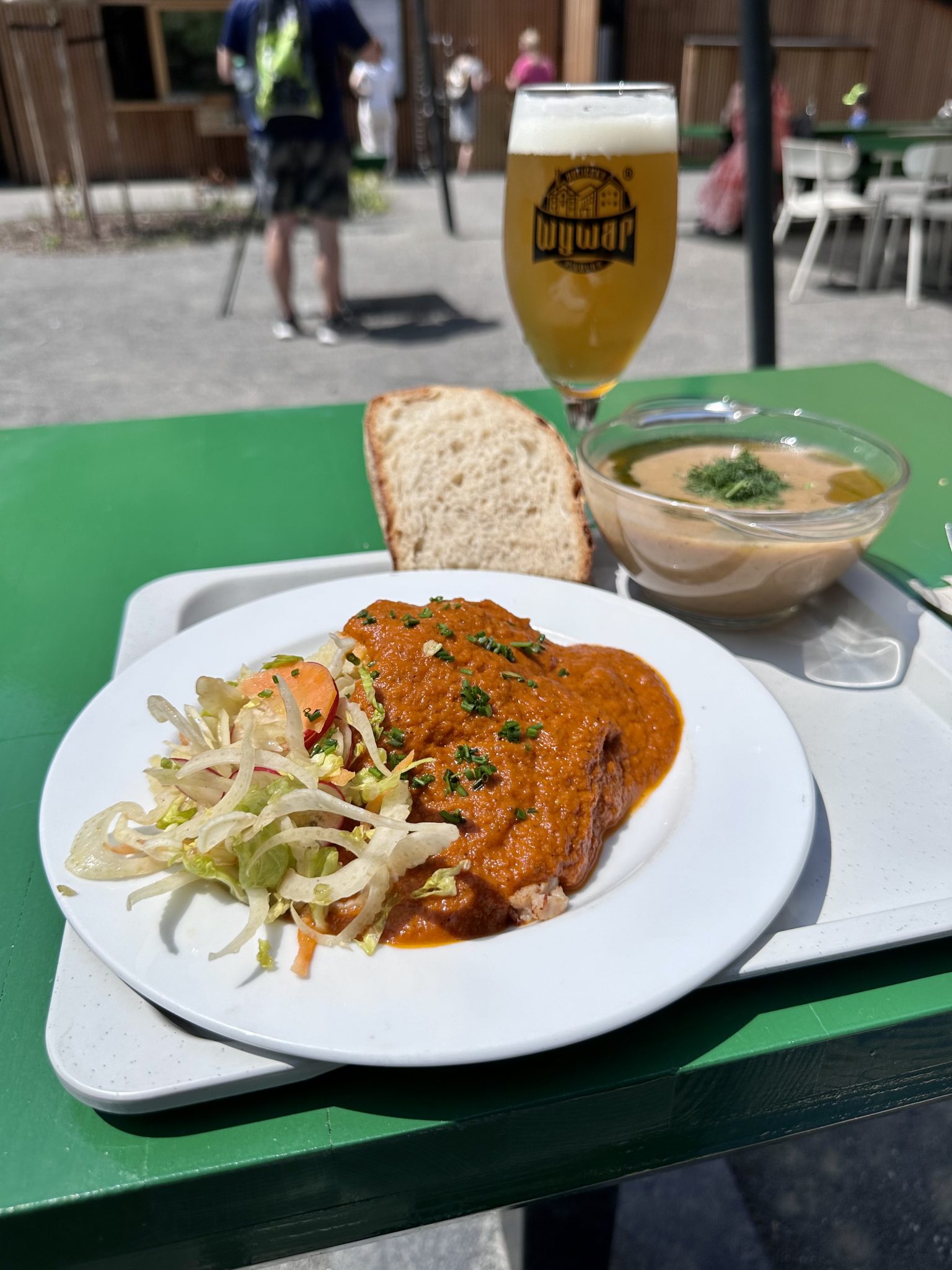 Kulajda je polievka, ktorá by sa mala povinne robiť všade. A tu je skvostná. Silná, krémová, výrazná a v nej akurátne ochutené vajíčko a dokonalá chuť a vôňa kôpru. Cena 4 €. Morčacie fašírky za 8,5 € s kašou a paradajkovou omáčkou mne osobne neznie ako vysnívaný obed.