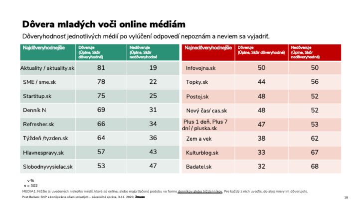 Analýza bola vykonávaná na vzorke n=302 medzi 23. a 28. októbrom 2020, respondentami boli mladí ľudia vo veku 16 až 30 rokov.