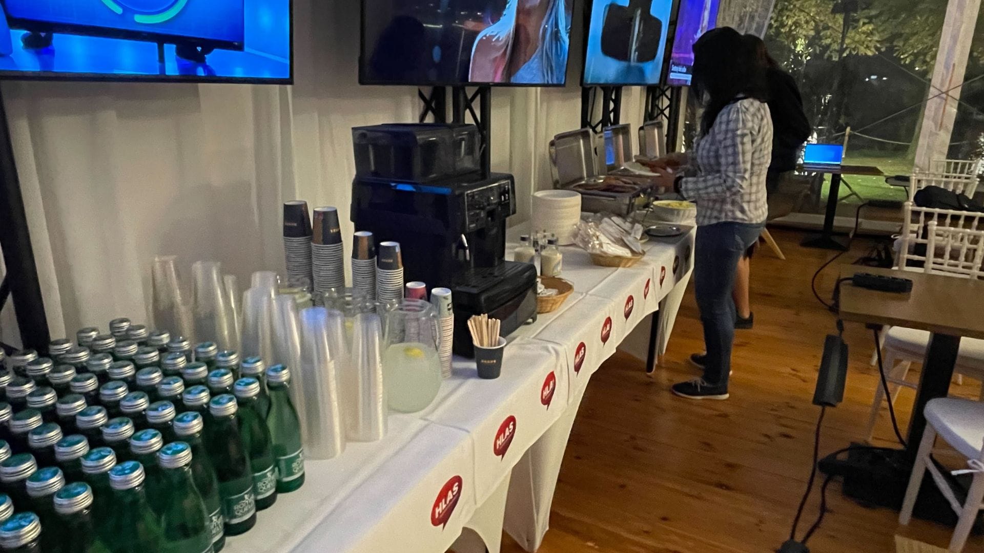Do stanu vedľa reštaurácie, kde má strana Hlas-SD svoju centrálu, priniesli občerstvenie pre novinárov v podobe rezňov a zemiakov. Nechýba ani káva a nealko nápoje.