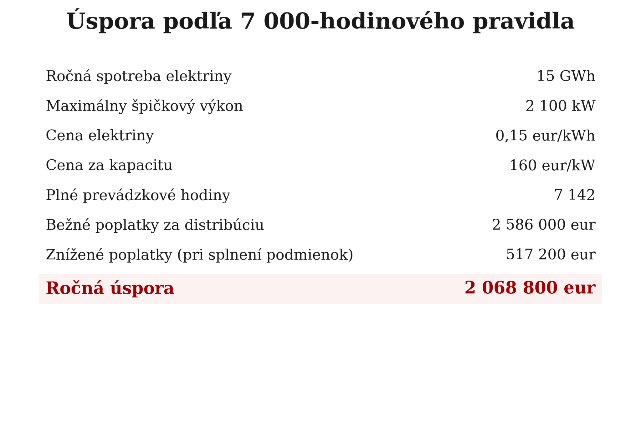 Modelový príklad: Firma so spotrebou 15 GWh ročne a špičkovým výkonom 2 100 kW by bez 7 000-hodinového pravidla zaplatila na poplatkoch vyše 2,5 milióna eur. Vďaka batériám, ktoré jej pomôžu udržať špičky na uzde, však platí len približne 517-tisíc eur – čo predstavuje ročnú úsporu viac než 2 milióny eur.