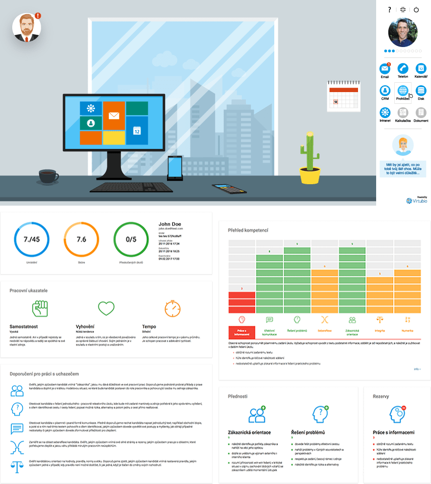 Sadneš si za počítač a na tvojom virtuálnom stole v novej práci ťa čaká niekoľko simulovaných úloh zo skutočného sveta. Cestou ťa povedie šéf Karel Krutík (meno zrejme nie je náhoda) a po ukončení má personalista na druhej strane dokonalý prehľad o tom, ako by si vo svojej novej práci zvládal každodenné zadania, môže tvoje schopnosti porovnať s inými uchádzačmi o pracovnú ponuku a dokonca zistiť aj to, na ktoré oblasti sa zamerať a následne ich rozvíjať. To všetko v sebe ukrýva program Virtubio, vytvorený pre profilovanie uchádzačov z dielne dvoch šikovných Čechov, Lukáša Palečka a Igora Kubíčka.