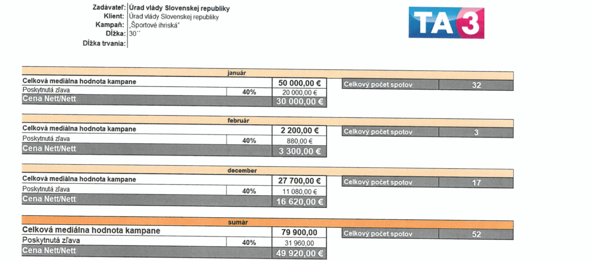 Úrad vlády SR v polovici decembra podpísal 7 takýchto zmlúv, ktoré dokopy stáli takmer 220-tisíc eur. Ich hlavným cieľom je propagovať kampaň „Podporujeme Športové srdce Slovenska“. Táto bude obsahovať 30-sekundové spoty o tom, čo sa v športovej infraštruktúre za posledné roky opravilo či postavilo.