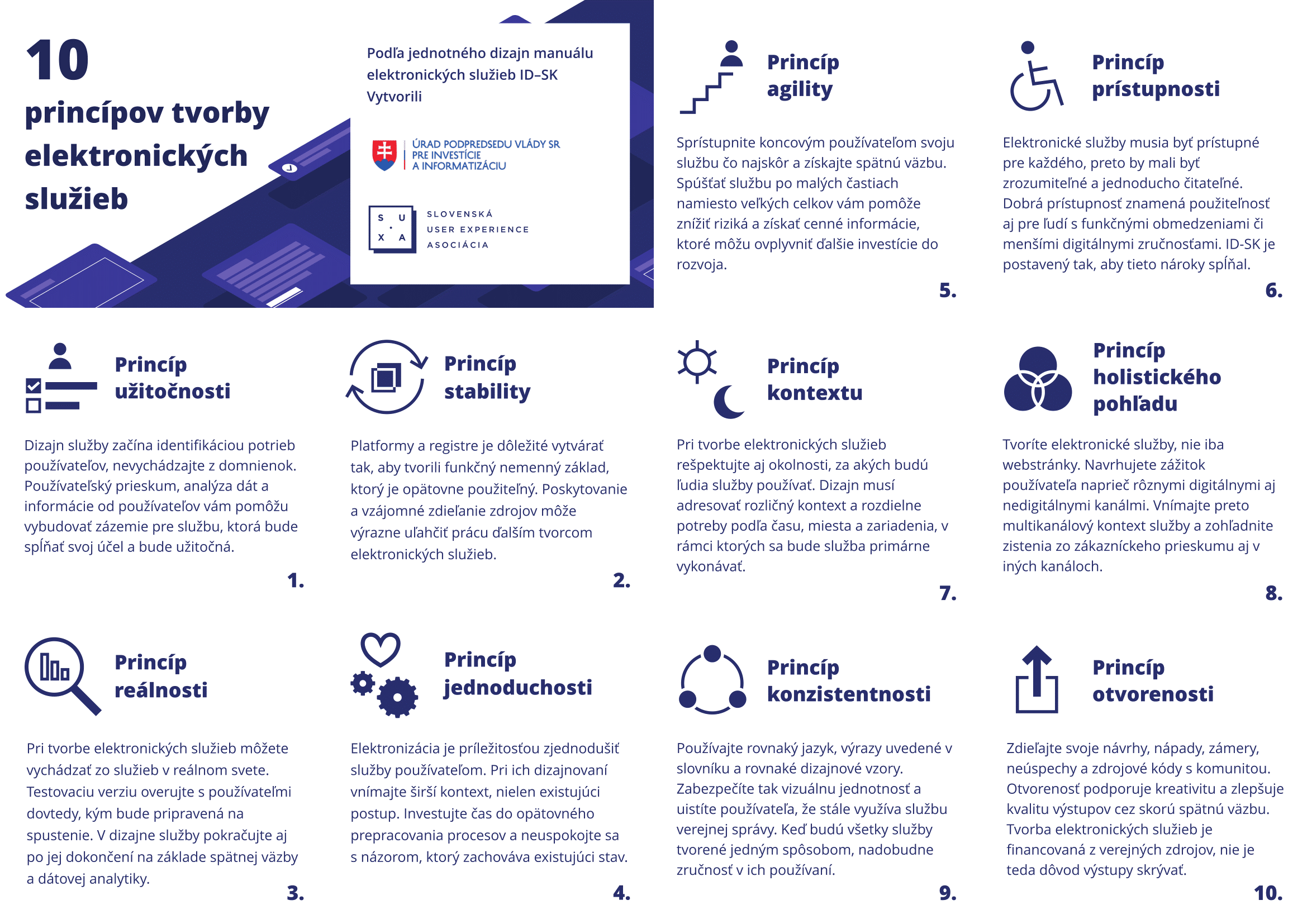 ID-SK tieto princípy plne zohľadňuje a zároveň dáva prvkom v elektronickej štátnej správe jednotný vzhľad. Je tak prvým pilierom k tomu, aby dodávatelia riešení pristupovali k práci konzistentne, efektívne, s ohľadom na koncového používateľa a aby pri práci neváhali spolupracovať.