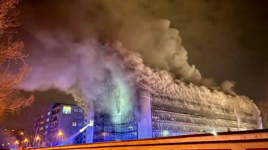 Približne o jedenástej večer hasiči stále zasahovali a z budovy stále šľahali plamene. Budova naďalej dymí.