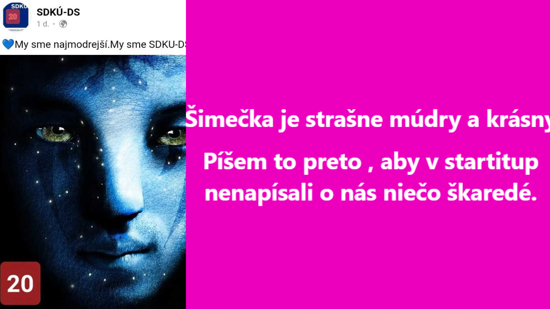 „My sme najmodrejší. My sme SDKÚ-DS,“ píše v nedávnom poste na stránke, ktorý dopĺňajú emotikony modrých srdiečok. Pod popisom svieti obrázok, ktorý môže byť povedomý filmovým fanúšikom. Nachádza sa na ňom totiž postava z trilógie Jamesa Camerona, Avatar.