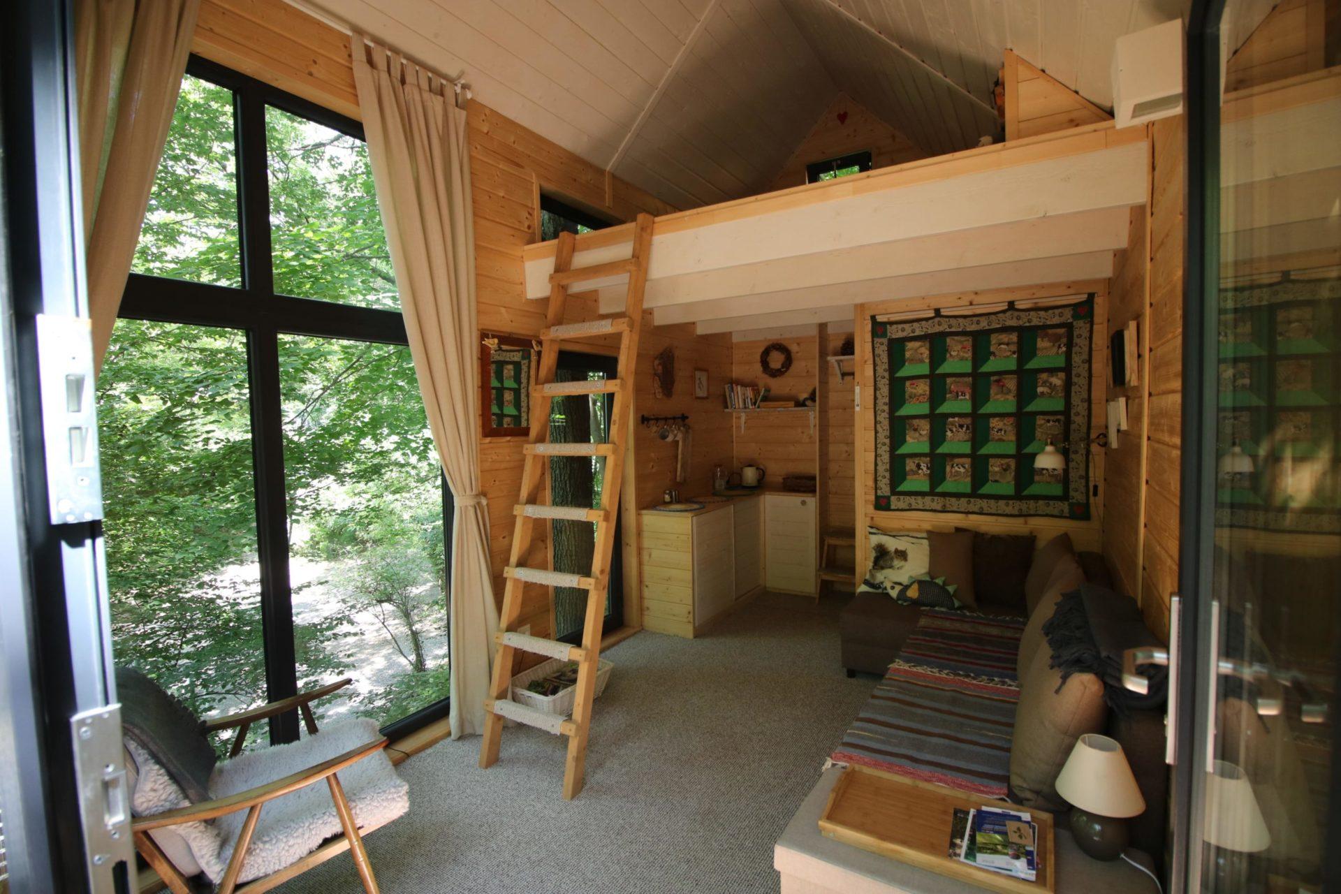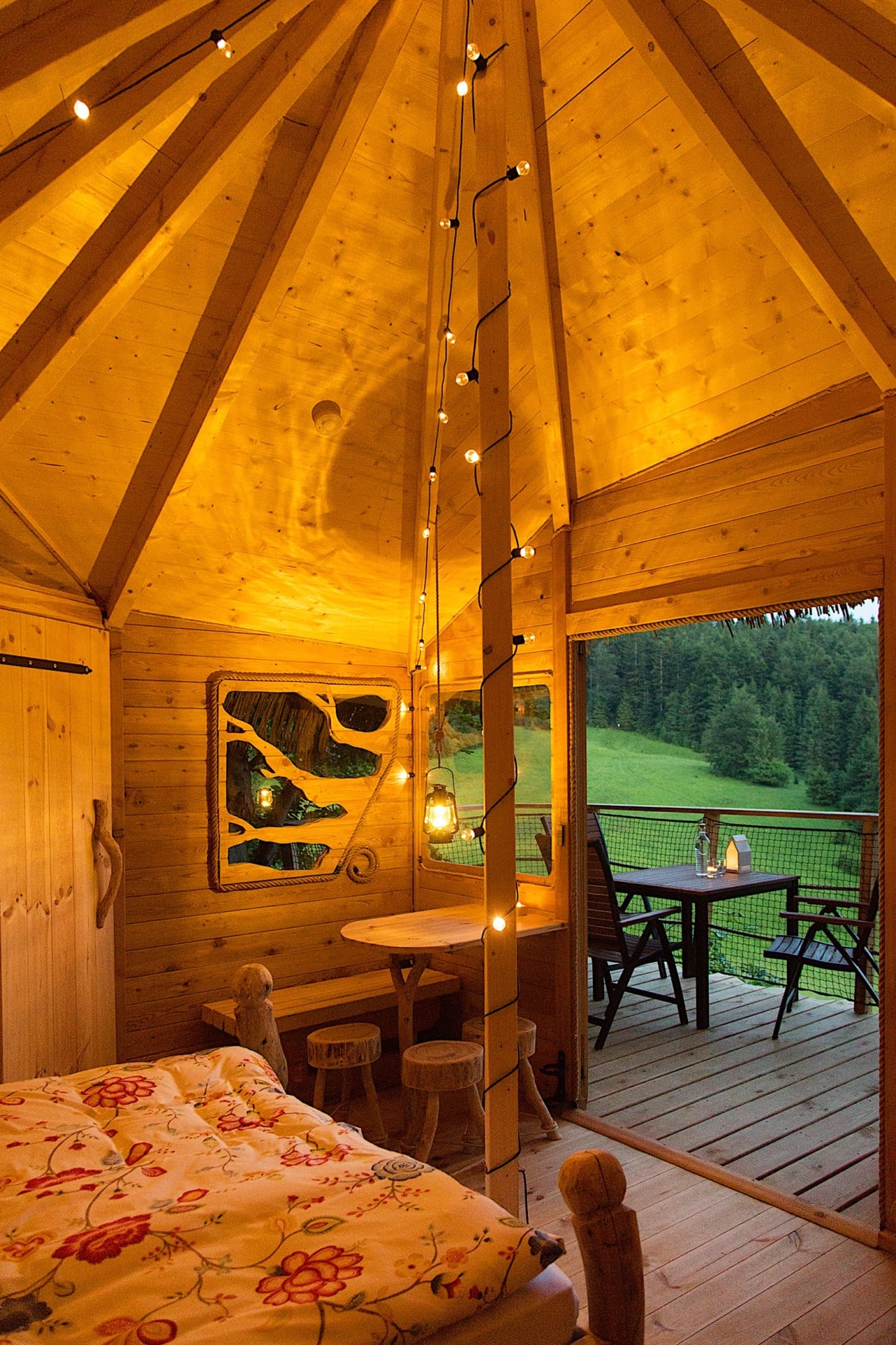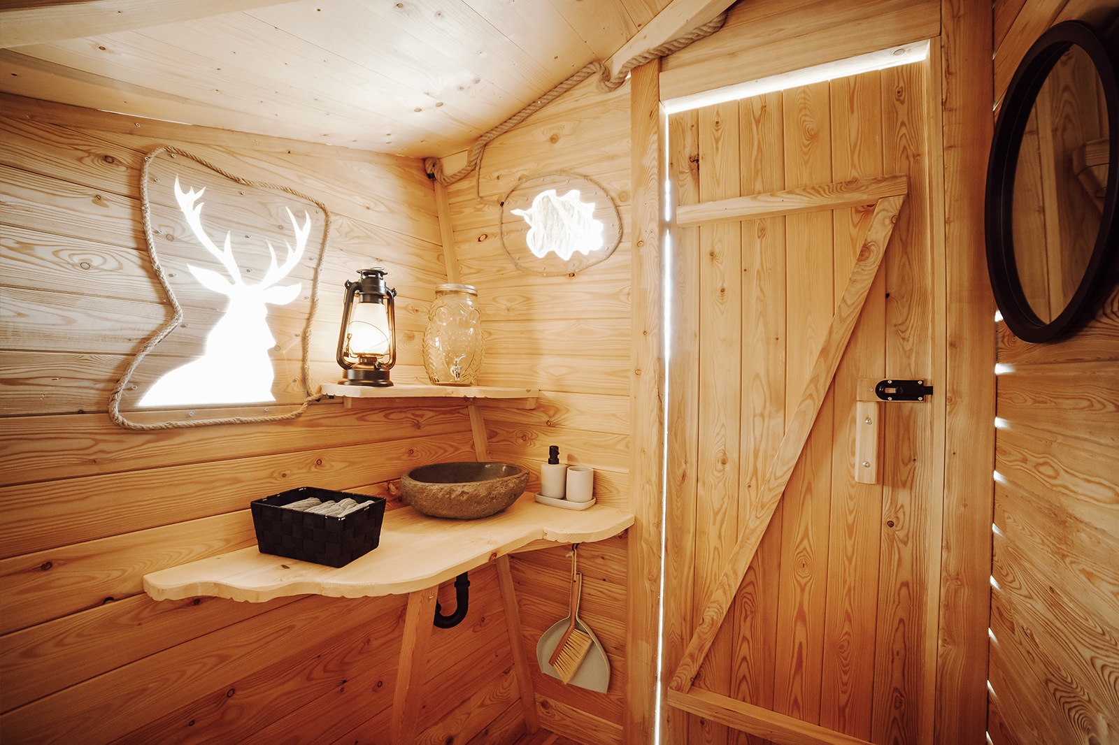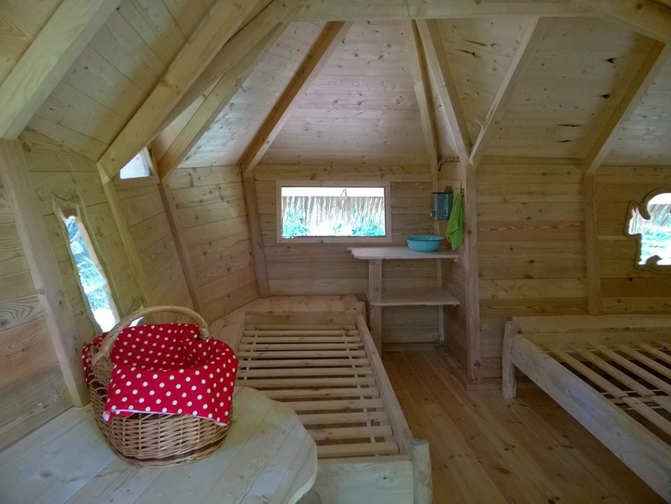 Domček je vybavený manželskou posteľou, jednou poschodovou posteľou s dvoma lôžkami, stolom a stoličkami. Nájdeš tu aj priestrannú terasu s vonkajším sedením či lesnú hojdačku na strome.