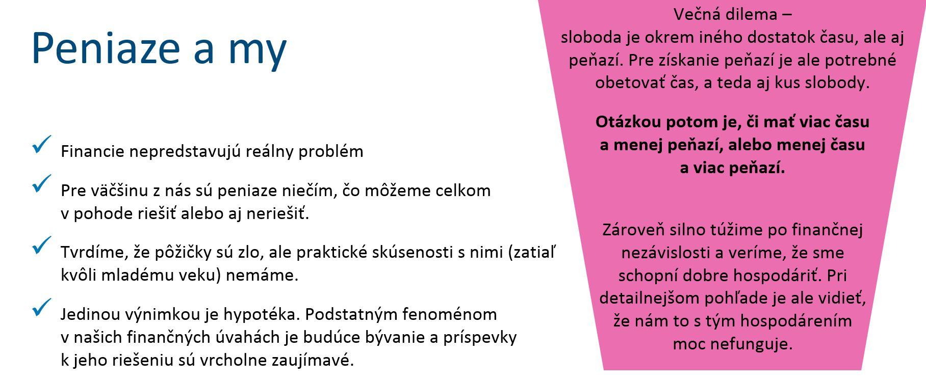 Ako ďalej dodáva, pre mladých ľudí do 30 rokov nie sú peniaze zásadným problémom. Až 75 % opýtaných považuje svoje príjmy za stabilné.