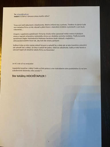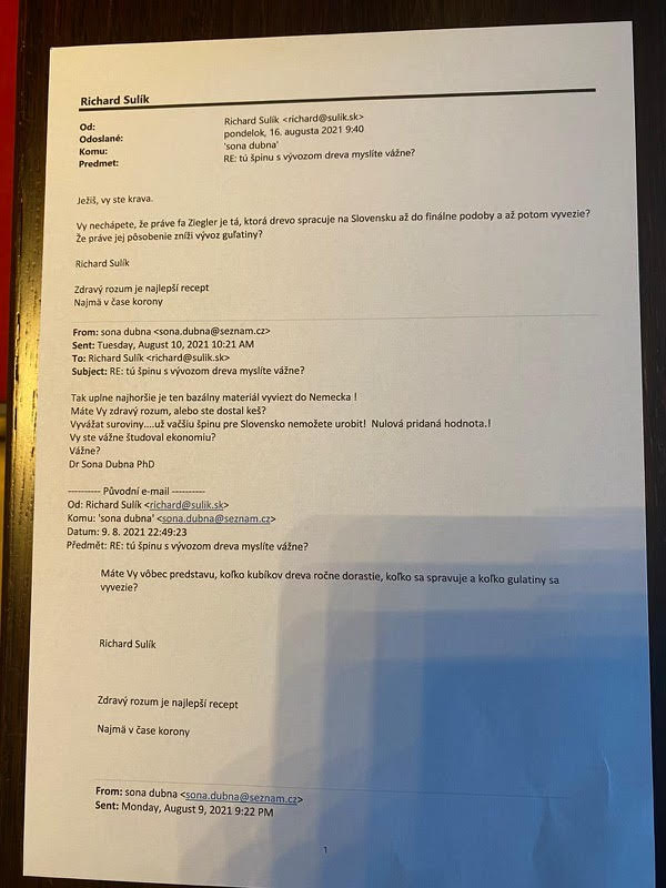 Na Richarda Sulíka sa valí vlna kritiky. Na sociálnej sieti sa objavila jeho nešťastná emailová konverzácia so slovenskou vedkyňou, kde ju nazval „k*avou“. Mal tak urobiť po tom, čo mu Soňa Dubná napísala pár správ, kde kritizovala, že do Rimavskej Soboty mieri bavorský spracovateľ dreva Ziegler Grup.