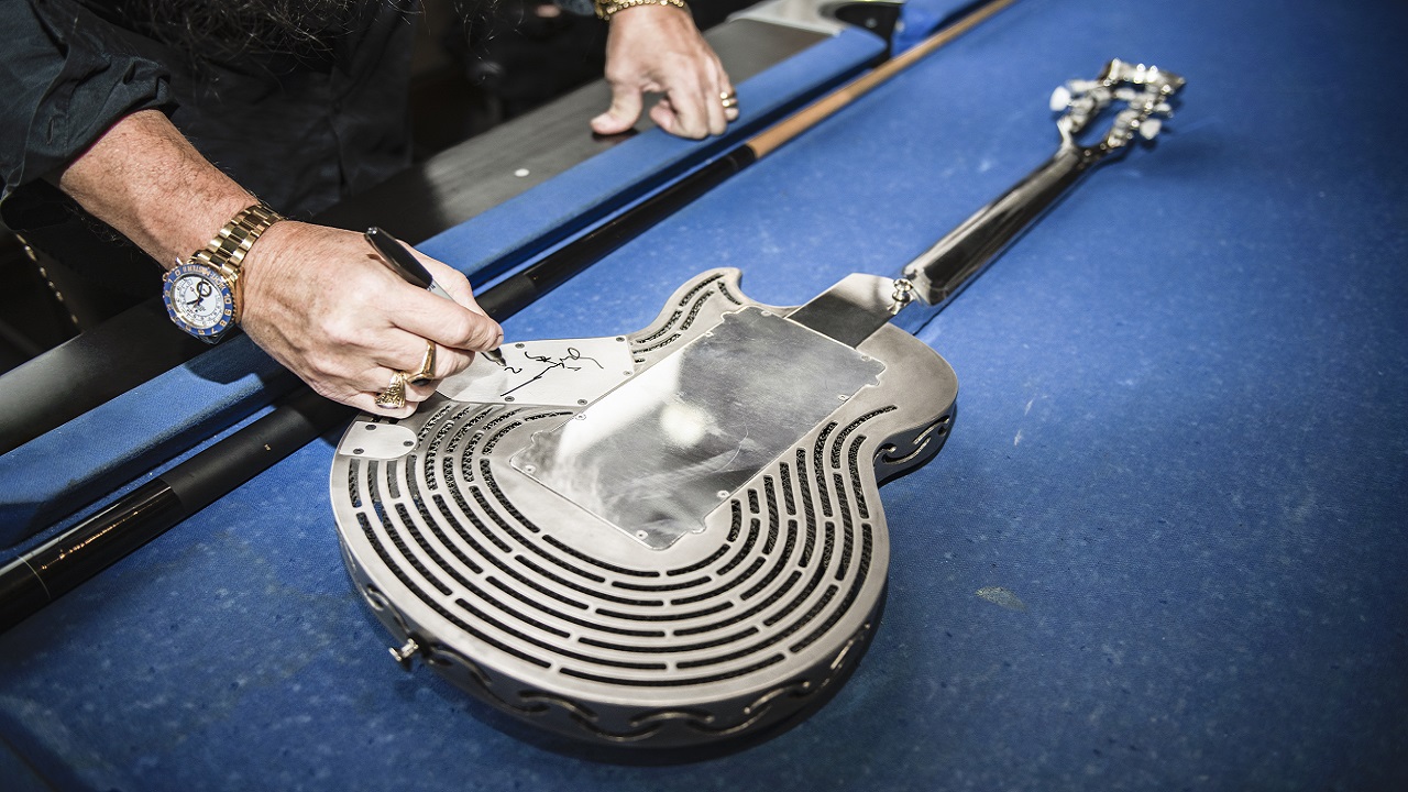 Švédska strojárenská spoločnosť Sandvik je známa aj vďaka nápaditej propagácii svojej práce a produktov. Najnovší počin z ich dielne sa radí medzi svetové unikáty. Vytvorili totiž prvú celokovovú elektrickú gitaru, ktorá je podľa ich tvrdenia nerozbitná.