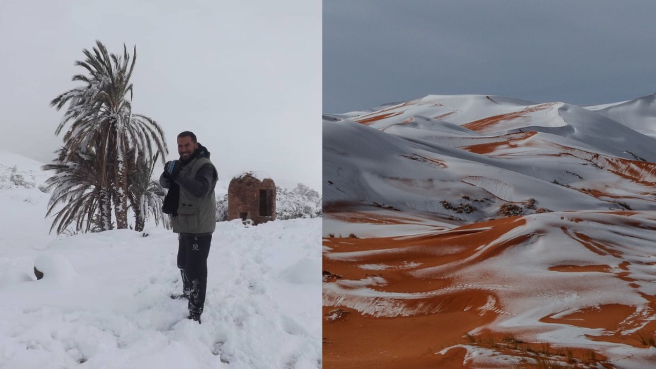 Nezvyčajný pohľad na duny posiate vločkami zachytil miestny fotograf Karim Bouchetata. Nie je to síce prvýkrát, kedy sa v Alžírsku objavil sneh, no takéto javy sú stále považované len za veľmi zriedkavé.