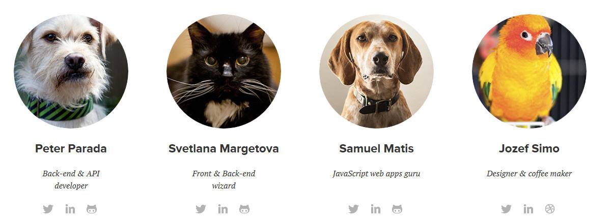 Už čoskoro budú naše originálne fotky. Momentálne sa čaká s fotkou iba na mňa, všetci ostatní už svoje majú. Problém je, že ja sa nerada fotím a na každej fotke vyzerám na 15 až 17 rokov. Preto to odkladám. Ale áno, zvieratá máme všetci celkom radi a mali sme aj veľa pozitívnych reakcií na sekciu Team od klientov.