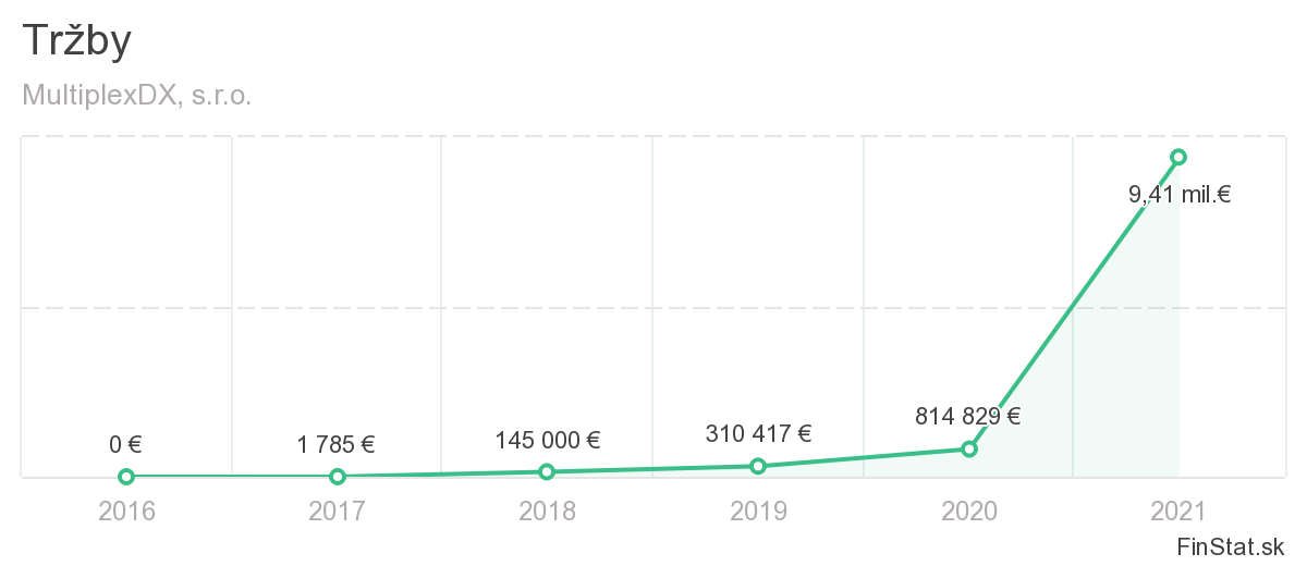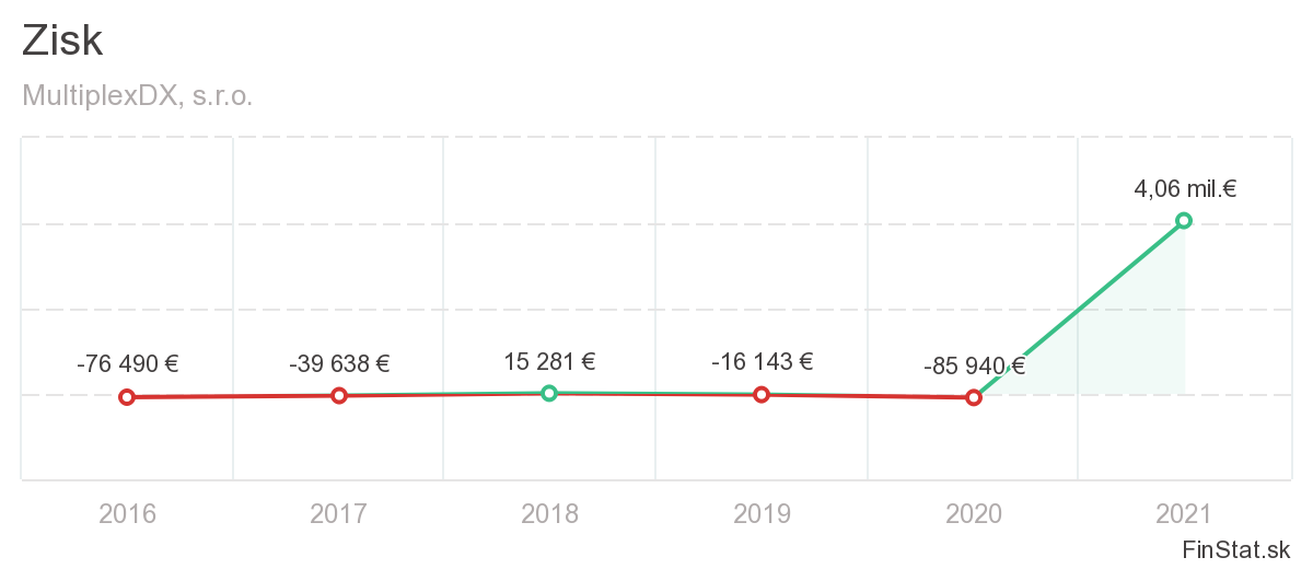 Spoločnosť MultiplexDX, s. r. o., sa v roku 2021 dostala do zisku z -85 940 eur na 4,062 milióna eur a tržby jej narástli z viac ako 814-tisíc eur na 9,414 milióna eur.