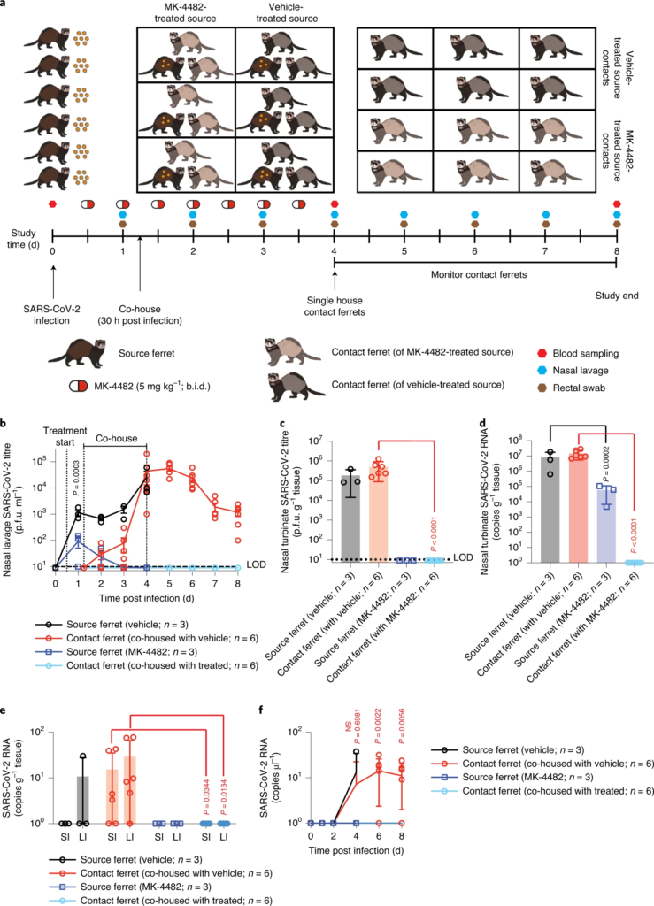 Plemper hovorí, že keď bola fretka infikovaná COVID-19 liečená antivírusovým liekom umiestnená do skupiny neinfikovaných fretiek, vyzeralo to, že liek rýchlo zabránil prenosu vírusu.