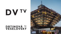 Logo DVTV a osvetlená budova Slovenského rozhlasu RTVS.