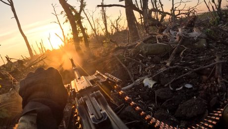 Vojak strieľa z guľometu, guľomet, paľba, cesta do Bachmutu