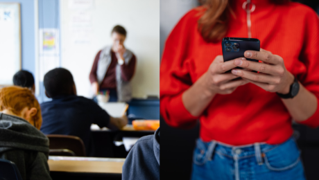 Učiteľ a žiaci a dievča s telefónom v rukách