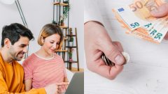 Žena a muž hľadia do notebooku a peniaze.