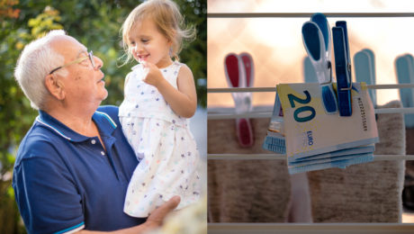 senior zdvíhajúci malé dievča a dvadsať eurové bankovky pripnuté štipcom