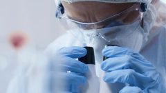 Vedkyňa pri práci so skúmavkou a žena na gauči si fúka nos do servítky.