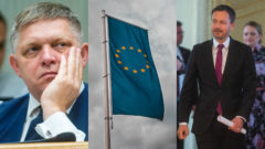 sklamaný fico a vlajka európskej únie v zamračenom počasí a usmiaty premiér eduard heger