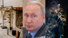 Chemické biologické laboratórium, kde sa pripravuje pokus, skúmavky a kvapaliny. Škeriaci sa Vladimir Putin. Ruský prezident. Vojak vychádzajúci z plynu, efekt zmutovaný vojak.