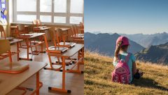 Na snímke je záber zo školskej triedy a dieťaťa v horách.
