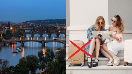 Nočná Praha a turistky na schodoch s kuframi a mapou.