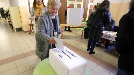 Volička vhadzuje obálku s referendovým lístkom do volebnej schránky. Na Sliači sa koná referendum o odmietnutí vojenskej základne.
