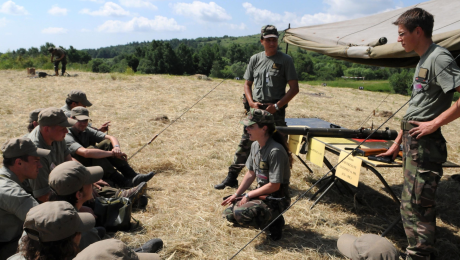Vojaci na výcviku učia mladších študentov, ktorí sedia na zemi.