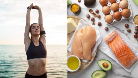Na snímke žena cvičí pri mori a stôl plný zdravých potravín.