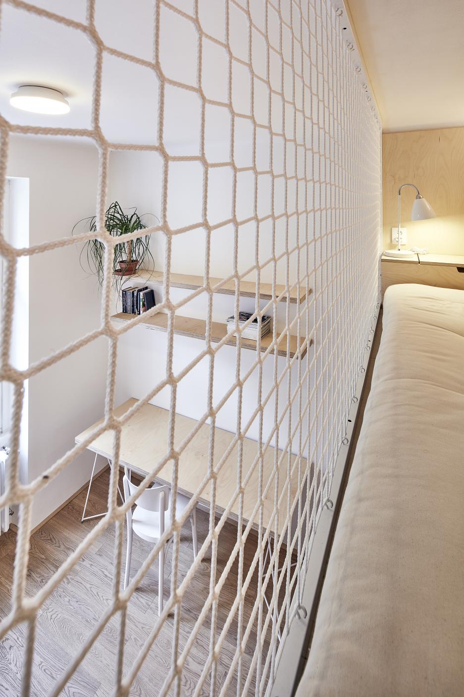 Obytná miestnosť s oknami, ktorá je orientovaná do ulice spája v sebe dve funkcie oddelené vizuálne rozdielnymi materiálmi – kuchyňu a svetlý priestor obývacej časti. Kuchyňa je ukrytá vo vstavanom nábytku a prirodzene prechádza do obytnej časti, ktorá sa odlišuje prírodnou farbou preglejky. Aj tu architekti kládli dôraz na praktické detaily ako je led osvetlenie zabudované do skriniek nad gaučom.