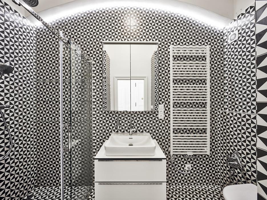 Zobraziť celú galériu (22)Kúpeľňa bola zväčšená spojením s pôvodne samostatnou toaletou a vďaka výraznému geometrickému čierno-bielemu obkladu získala súčasný charakter. Časť priestoru bývalého WC poslúžila naviac ako technická miestnosť. Spálňa orientovaná do vnútrobloku umožnila svojim vysokým stropom vytvoriť komfortné poschodie na spanie, pod ktorým sa nachádza priestranný šatník. Súčasťou šatníka sú aj pohodlné schody. Zvyšný priestor je využívaný ako pracovňa.
