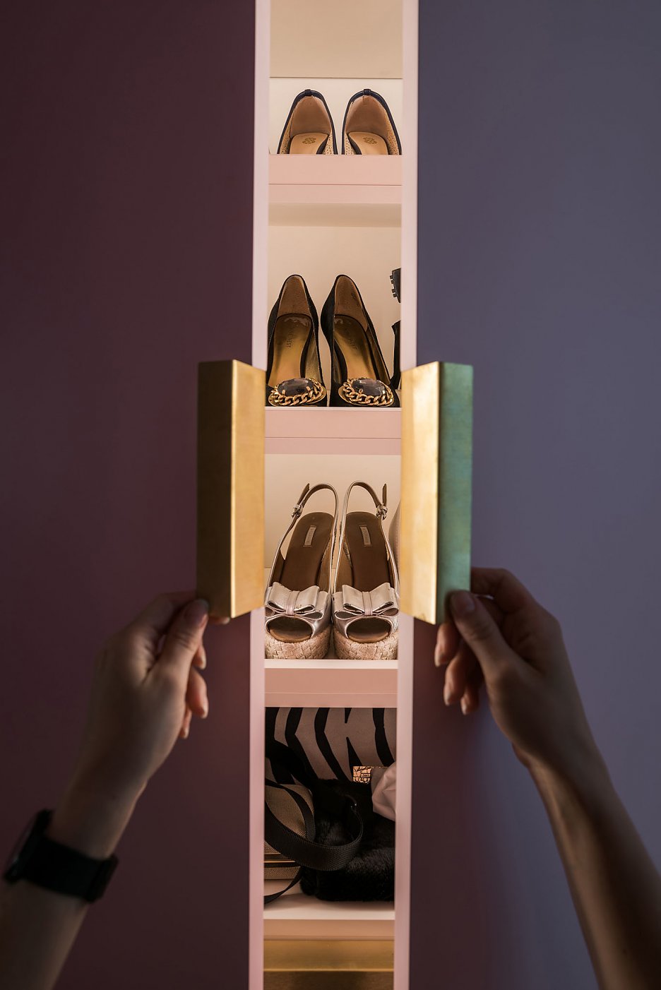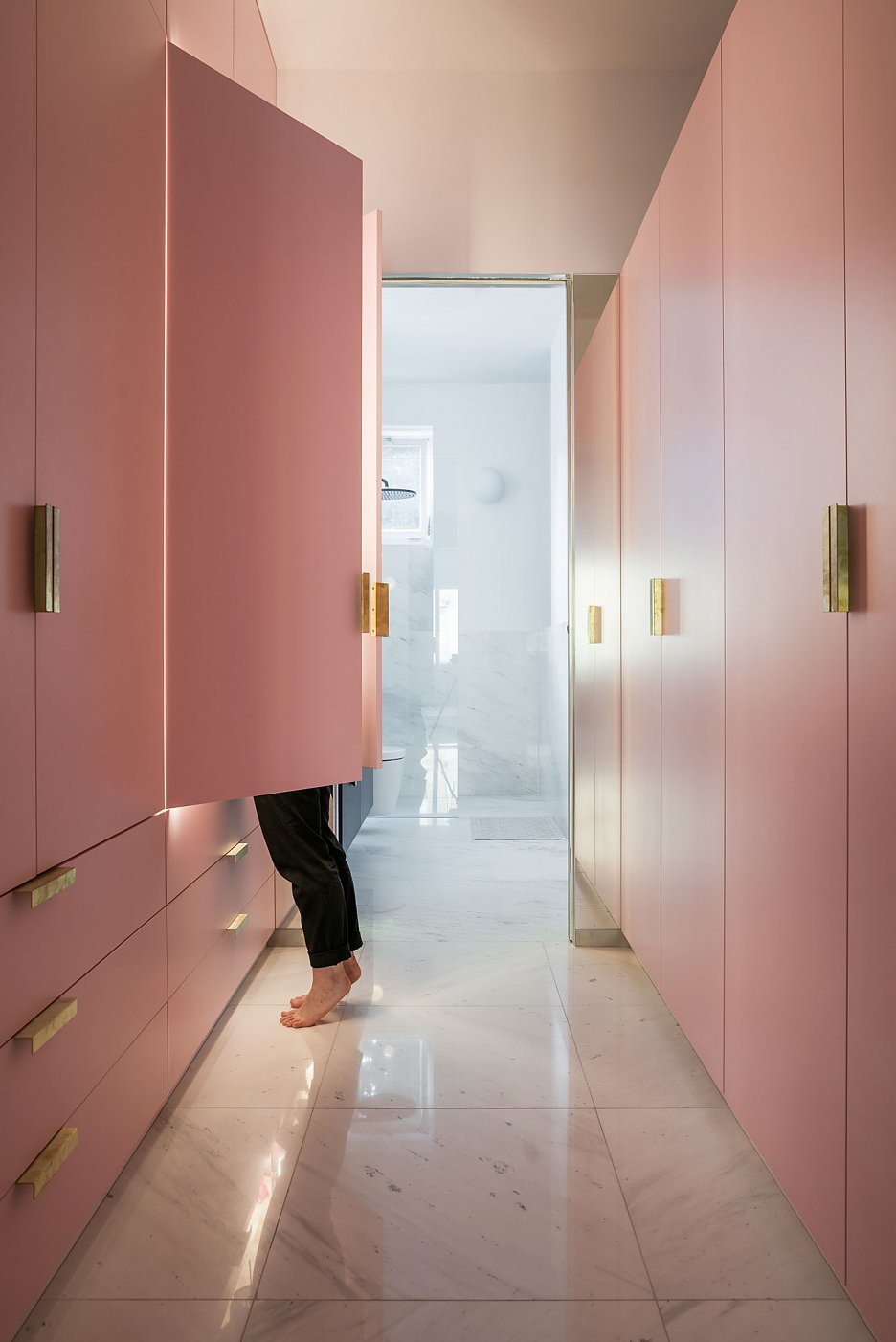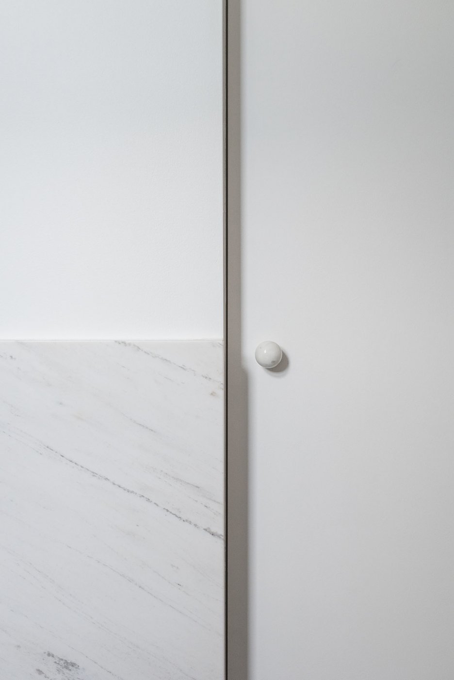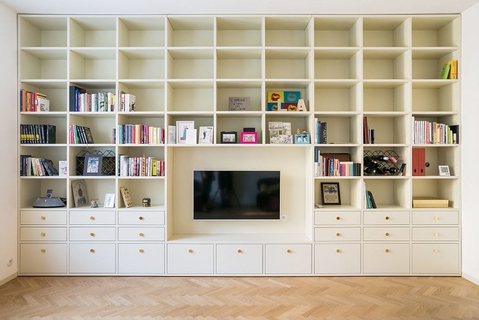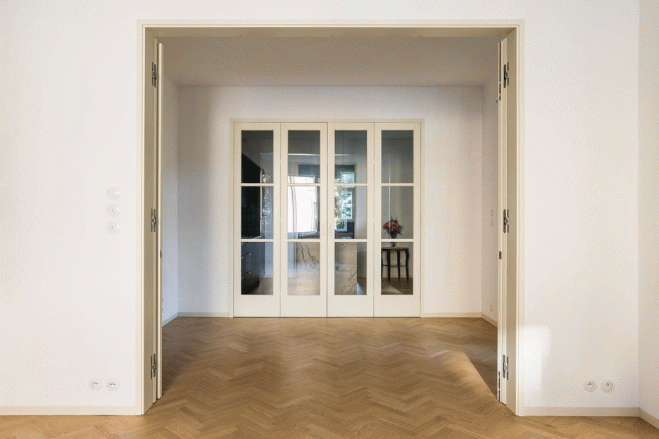 Dispozícii dominuje trojica za sebou radených miestností – kuchyňa, jedáleň a obývacia izba. Miestnosti sú prepojené rozmernými štvorkrídlovými dverami, čo umožňuje ich transformáciu na jeden funkčný celok. Na rovnakom princípe funguje prepojenie obývacej izby a pracovne. Architekti pri navrhovaní počítali s rozrastaním rodiny, pracovňa môže byť jednoducho transformovaná na detskú izbu. Spálňa sa napája na dennú zónu z kuchyne, alebo cez priechodný šatník a kúpeľňu priamo zo zádveria. Naprieč bytom sa tiahne šatníková stena, ktorá poskytuje dostatok úložného priestoru pre celú rodinu.